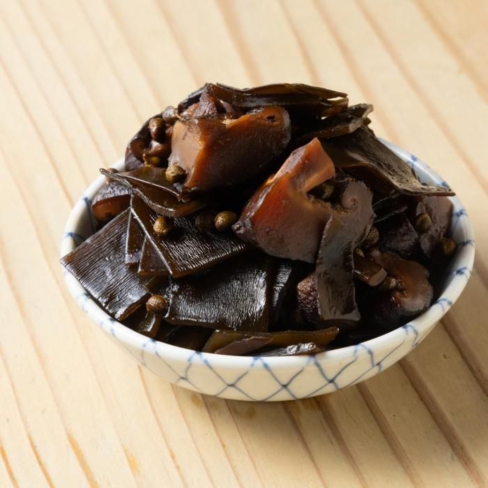 昆布(国産)、椎茸(中国産)、清酒、醤油、実山椒、砂糖、みりん(その他原材料の一部に小麦・大豆を含む)/調味料(アミノ酸)等